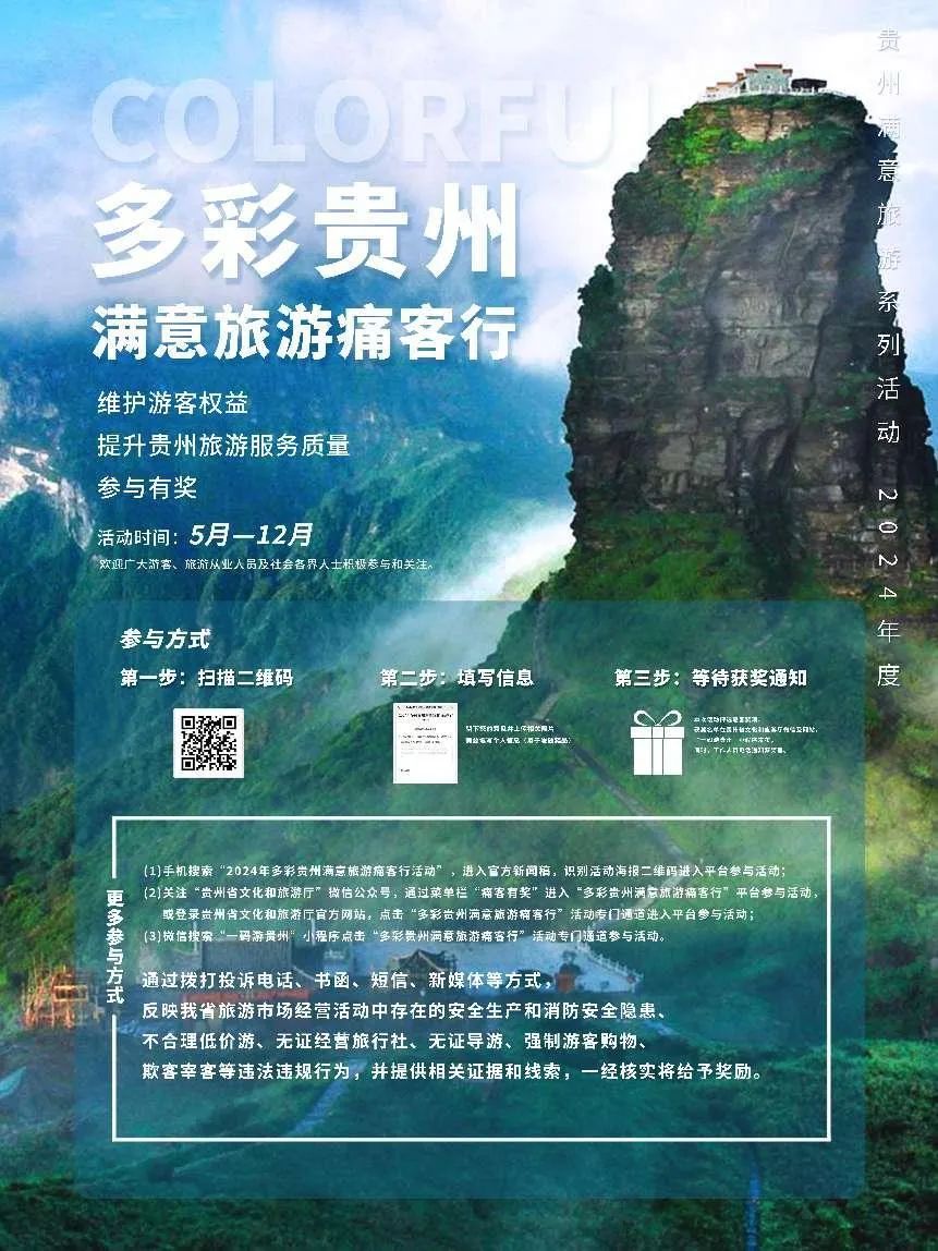 5月1日,“2024年多彩贵州满意旅游痛客行活动”正式启动。活动由贵州省文化和旅游厅主办,中国经济信息社承办,已连续举办7年。凡是在黔旅游或关心、关注、支持贵州旅游发展的人士均可登录“贵州旅游痛点征集平台”,以“痛客”身份反映问题,提出建议。