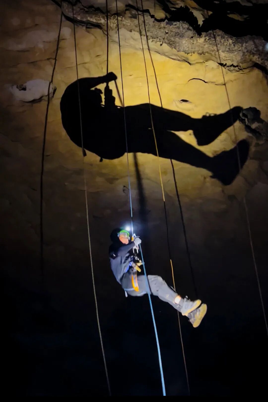杨东与周朝恩毕业于贵州医科大学户外专业。体力极好,性格也温和,并不嫌弃我们的笨拙。在洞里常常四肢贴地,蹭满腿泥算不得什么,只是我极度恐高,偶尔的木桥、铁索、滑索都是不小的挑战。石头是潮的,手心也是潮的,先进洞的六人团队早已没了踪影,洞内只有黑暗中头灯前的光、大大小小的钟乳石、呼吸产生的微小的水珠形成眼前大团的雾气、水滴声、彼此的喘气声。