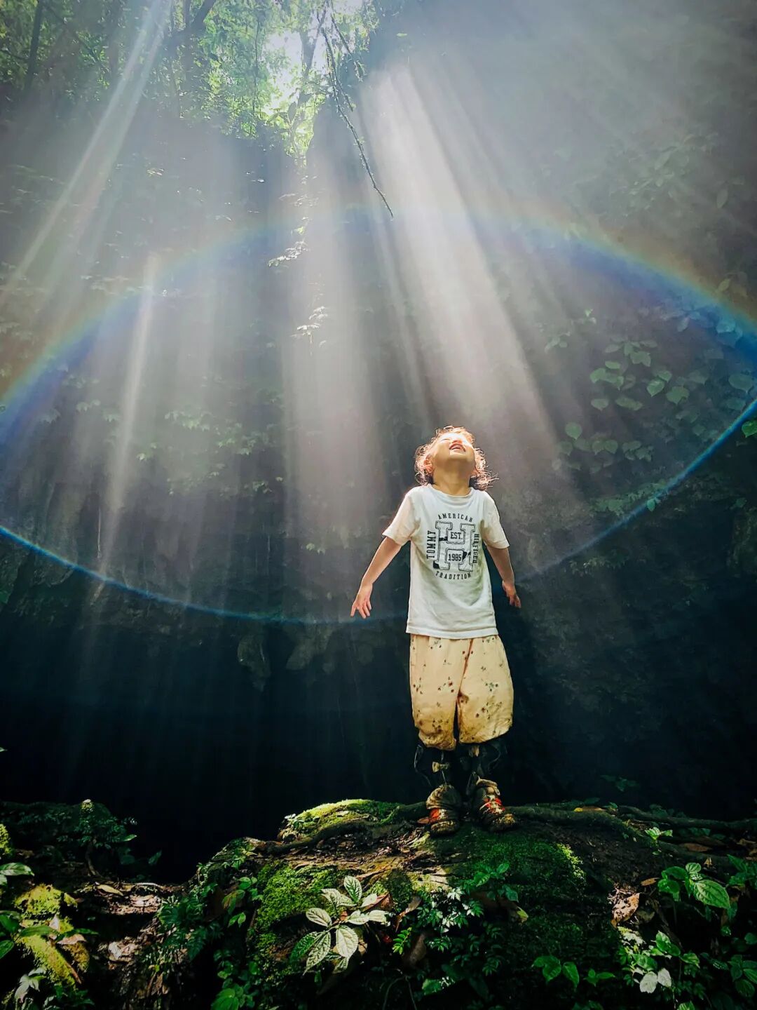 在大自然里无拘无束的玩水,小朋友总是最高兴。凑巧的是,拍下照片的那一刻,阳光刚好穿过枝叶的缝隙,在水雾的帮助下现出霓虹,像一只眼睛