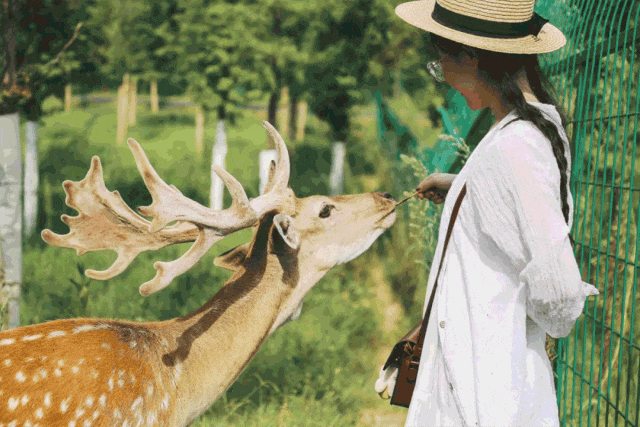 "林深时见鹿" 的意境,不必远赴奈良。 来这里,就能亲手投喂温顺的大红鹿。鹿园里,大片草坪铺展,清冽空气裹挟着草木清香;大红鹿迈着步子穿梭其间,灵动身影掠过绿意,纯净眼眸像盛着晨露。这一幕幕,都是大自然亲笔勾勒的珍贵画面。