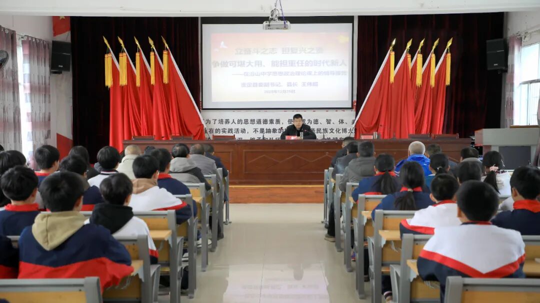 12月25日,县委副书记、县长王伟超到沿山中学宣讲党的二十届四中全会精神,并以“立奋斗之志 担复兴之责,争做可堪大用、能担重任的时代新人”为题为师生代表讲授了一堂生动的思想政治课。副县长王大兰参加。